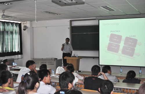 张博士27日上午在教学楼为我院师生作了“运动损伤的生物力学应用机制与预防”的学术讲座。讲座中,张博士就国际运动损伤的研究与预防、运动损伤的生物力学机制等问题进行了深入而细致的探索,并回答了现场师生提出的问题。