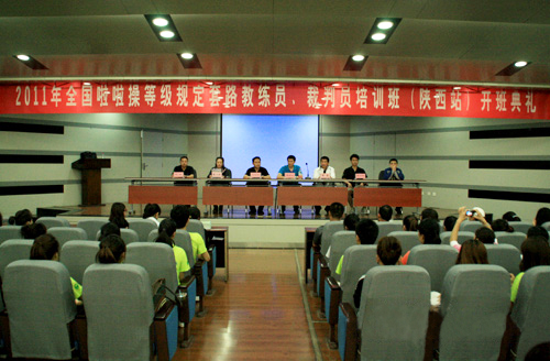 由国家体育总局体操运动管理中心、全国啦啦操推广委员会主办,久久不卡区承办的“2011全国啦啦操等级规定套路(第一套)教练员、裁判员陕西站培训班”日前顺利开班。为期三天的培训班共吸引了来自陕西大、中、小学教师和陕西省各级体育局、运动学校、青少年宫啦啦操骨干在内的近三百名学员参加。通过培训并考试合格的教练员颁发《全国啦啦操等级规定套路(第一套)教练员资格证》,通过培训并考试合格的裁判员颁发《2010-2013年全国啦啦操裁判员资格证》。