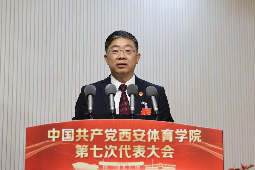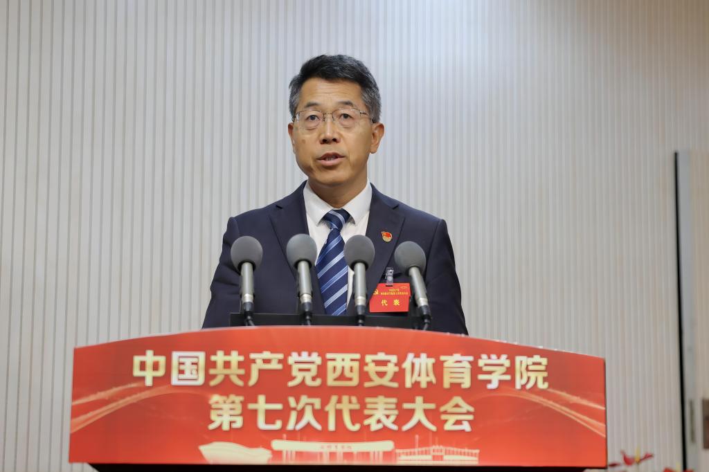 尤磊代表省体育局党组向大会的召开表示热烈祝贺。他在讲话中指出,省体育局围绕“加快建设体育强省,努力争做西部示范”主题,部署了“六个争做西部示范”和30项具体行动,为陕西体育事业高质量发展描绘了宏伟蓝图、指明了方向路径、提供了科学方法、细化了落实举措。西安体院要努力建设一流体育大学,办人民满意的高等教育,为加快建设体育强省贡献应有力量。一是始终坚持党的领导。全面贯彻新时代党的教育方针,牢牢把握社会主义办学方向,坚决落实高校管党治党责任,坚定拥护“两个确立”、坚决做到“两个维护”。二是始终坚持以体为本。要把体育作为学校核心竞争力,主动融入全省体育工作大局,主动服务我省各运动项目发展,主动参与我省复合型教练团队建设,为陕西体育高质量发展提供智力支持、科技服务、人才保障。三是始终坚持立德树人。必须坚持把“立德树人”贯穿高校教育工作始终,作为检验教育教学工作的根本标准,贯穿思想道德、文化知识、社会实践各环节,融入教育教学全过程,加强意识形态建设,守牢思想政治主阵地,涵养优良学风、校风、教风。四是始终坚持服务大局。要聚焦陕西体育事业发展所需,集中力量开展体育科研,充分发挥学术优势,加快成果转化,切实提升学校对陕西体育事业发展的支撑力和贡献度。五是始终坚持携手共进。省体育局将一如既往地关心、支持学校的改革发展,积极为学校各项事业发展提供大力支持、创造有利条件,充分发挥西安体院“一家人”的优势和作用,开展多层次、宽领域、全方位的交流合作,实现双向奔赴、强强联合、互惠互利。