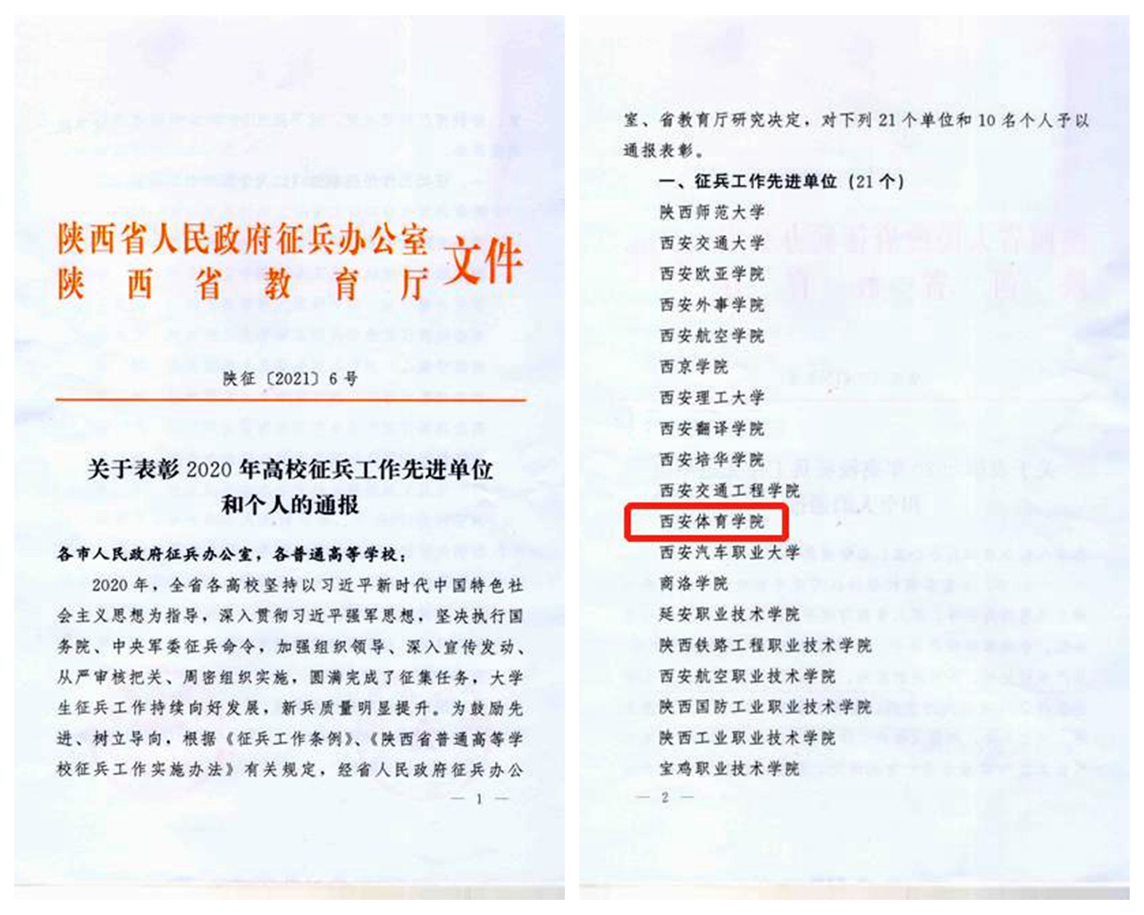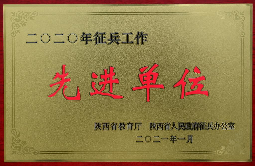本网讯  日前,陕西省人民政府征兵办公室、陕西省教育厅签发《关于表彰2020年度高校征兵工作先进单位和个人的通报》(陕征〔2021〕6号),我校荣获2020年陕西省高校征兵工作先进单位。